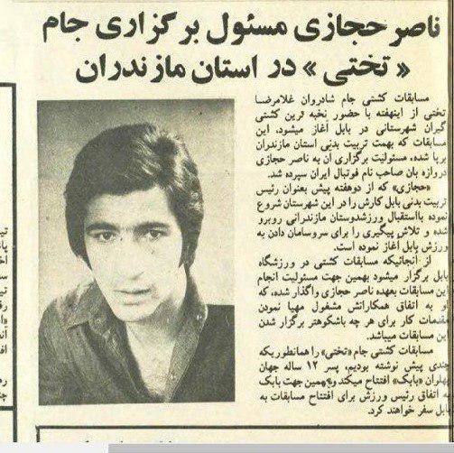 در بریده جرایدی که از آن زمان وجود دارد خبری دراین ارتباط با عکسی از ناصرحجازی در 25 تیرماه 1358 منتشر شد که در آن آمده است:" ناصر حجازی مسئول برگزاری جام "تختی" در استان مازندران" در ادامه خبری که با این تیترمنتشر شده نوشته شده است:" مسابقات کشتی شادروان غلامرضا تختی از اینهفته با حضور نخبه ترین کشتی گیران شهرستانی در بابل برگزار می شود، این مسابقات که به همت تربیت بدنی استان مازندران برگزار شده، مسئولیت برگزاری آن به ناصرحجازی دروازه بان صاحب نام ایران سپرده شده است. حجازی که از دو هفته پیش بعنوان رئیس تربیت بدنی بابل کارش را در این شهرستان شروع نموده با استقبال ورزش دوستان مازندرانی روبرو شده و تلاش و پیگیری را برای سرو سامان دادن به ورزش بابل آغاز نموده است.از آنجائیکه مسابقات کشتی در ورزشگاه بابل انجام می شود به همین جهت مسئولیت برگزاری این مسابقات به عهده ناصرحجازی است که او به اتفاق همکارانش مشغول مهیا کردن مقدمات کار برای هرچه باشکوهتر برگزار شدن این مسابقه می باشد.مسابقات کشتی جام "تختی" را همانطور که قبلا نوشته بودیم ، پسر دوازده ساله جهان پهلوان "بابک" افتتاح می کند و به همین جهت بابک به اتفاق رئیس ورزش برای افتتاح مسابقات به بابل سفر خواهد کرد."
