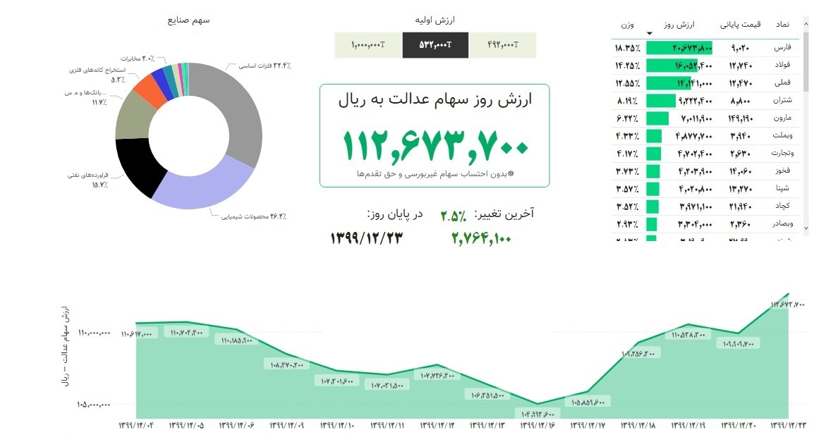 در پایان معاملات امروز بازار سهام، ارزش سهام عدالت درمقایسه با چهارشنبه (۲۰ اسفندماه)، ۲.۵درصد (۲۷۷هزار تومان) افزایش یافت و ارزش سبد ۵۳۲هزار تومانی و یک میلیون تومانی سهام عدالت به ترتیب به ۱۱ میلیون و ۲۶۷هزار تومان و ۲۱ میلیون و ۲۲۱هزار تومان رسید.