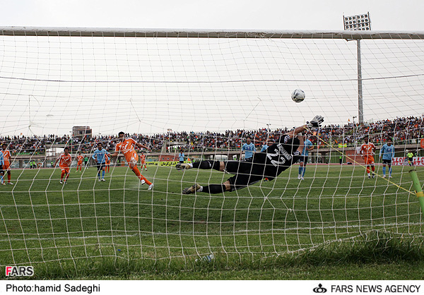 چند ثانیه بعد مدافعان مس به یک باره متوجه شدند که توپ هنوز به بیرون نرفته و حمله حریف ادامه دارد؛ البته آنها خیلی دیر متوجه این موضوع شدند چرا که پاس اسماعیلی فر به طرز غافلگیر کننده ای پس از ضربات شهباززاده و کریمی مقابل پای امید نورافکن قرار گرفت و این بازیکن نیز با یک ضربه غیرقابل مهار توپ را به طاق دروازه مس کوبید تا یک گل عجیب در اصفهان به ثمر برسد.