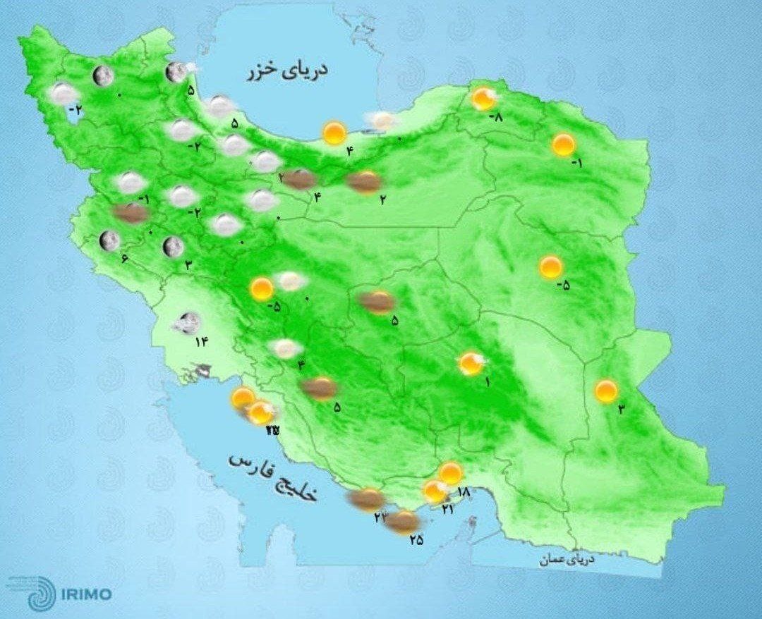 در این روز، برای سواحل غربی دریای خزر افزایش ابر و بارش پراکنده انتظار می‌رود و در سایر نقاط کشور جوی پایدار پیش‌بینی می‌شود.