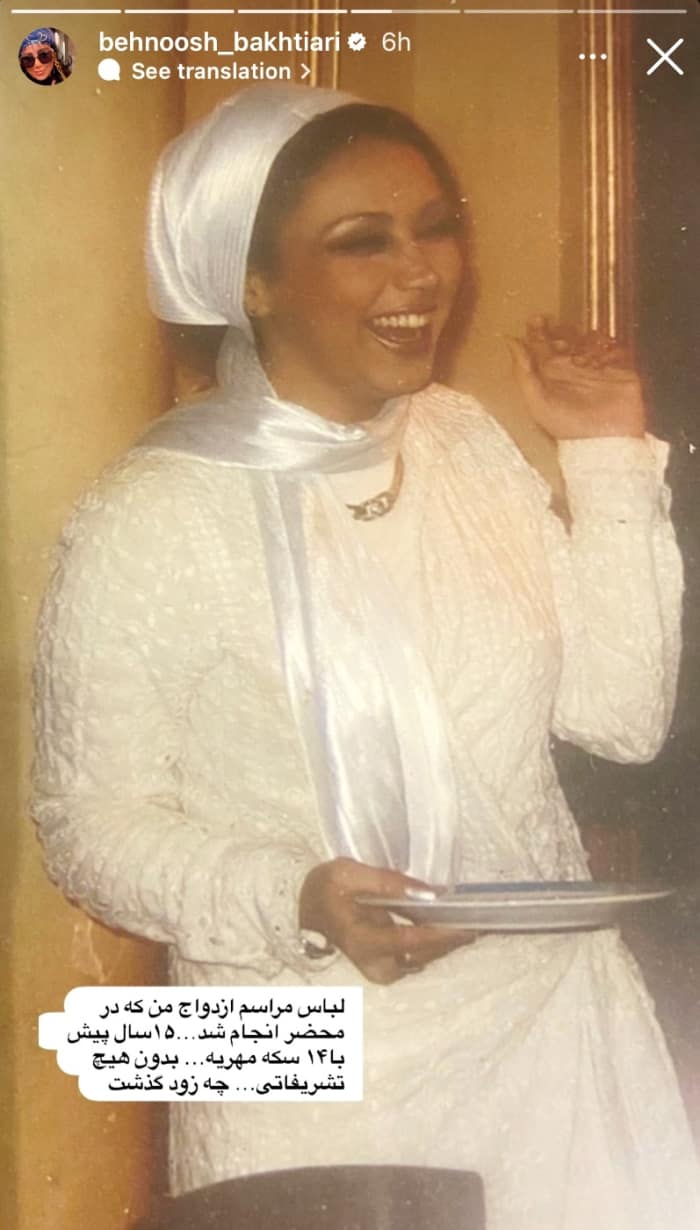 در نهایت این بازیگر به تازگی در اینستاگران تصویری از عروسی خود کهسالها پیش و به دور از تشریفات برگزار شده بود را منتشر کرد. بهنوش بختیاری با منتشر کردن عکس فوق در استوری اینستاگرامش نوشت: