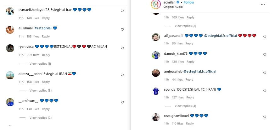 پس از این اتفاق، هواداران تیم تهرانی که به شدت از این موضوع خوشحال بودند به پیج میلان رفتند و با کامنت‌هایی شامل قلب آبی فضای پیج این تیم ایتالیایی را به نوعی استقلالی کردند!