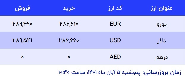 قیمت دلار در صرافی‌های بانکی، امروز ۵ آبان ۱۴۰۱