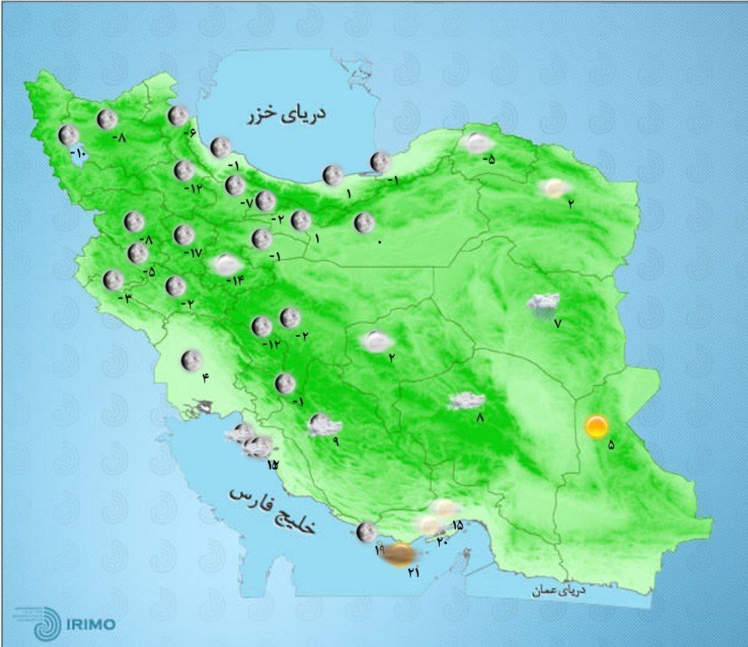 گودرزی گفت:امروز صبح ایستگاه هزارکانیان با دمای کمینه ۲۵ درجه زیرصفر، بویین و میان دشت و خیرآباد زنجان با دمای ۲۱ درجه زیر صفر و تکاب با دمای ۲۰ درجه زیرصفر جزو سردترین مناطق و ایستگاههای کشور بودند.