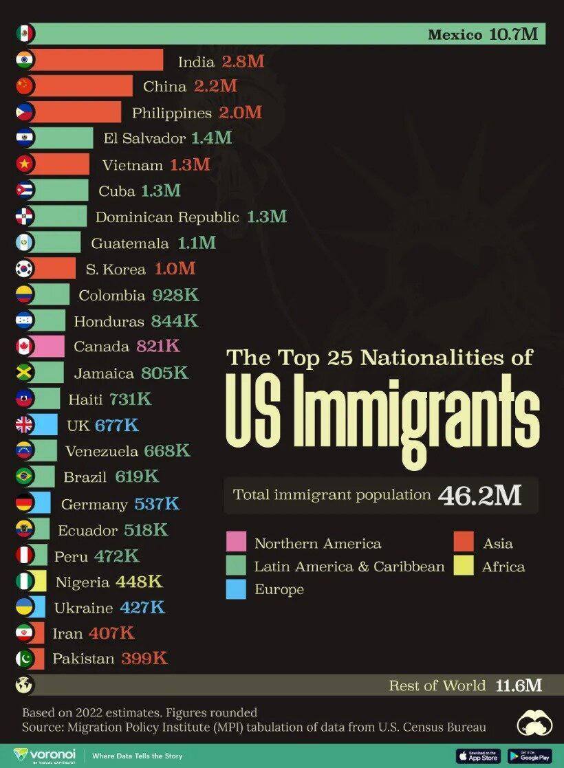 روزنو :ایالات متحده خانه بیش از ۴۶ میلیون مهاجر است که تقریباً ۱۴٪ از کل جمعیت آن را تشکیل میدهند. اینفوگرافیک ۲۵ کشور مبدأ مهاجران ایالات متحده را بر اساس برآوردهای سال ۲۰۲۲ نشان میدهد. ایران با ۴۰۷ هزار مهاجر به آمریکا در ردیف ۲۴ این جدول قرار دارد.