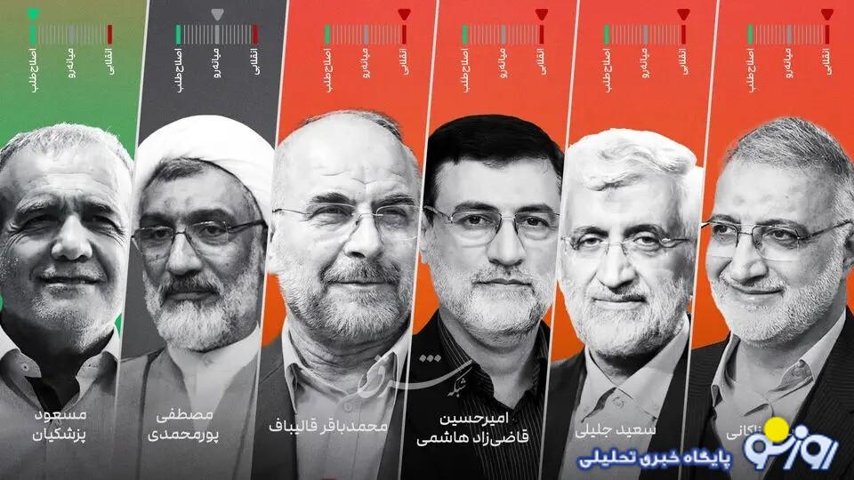 روزنو :‌عبدالرحمن فتح‌الهی: پس از شش روز انتظار نهایتا بعدازظهر دیروز (یکشنبه) شورای نگهبان اسامی شش کاندیدای تأییدصلاحیت‌شده انتخابات ریاست‌جمهوری را اعلام کرد که شامل محمدباقر قالیباف، امیرحسین قاضی‌زاده‌هاشمی، مصطفی پورمحمدی، علیرضا زاکانی، سعید جلیلی و مسعود پزشکیان است. اگرچه از قبل رد صلاحیت چهره‌هایی مانند محمود احمدی‌نژاد قابل پیش‌بینی بود، اما موضوع  رد صلاحیت علی لاریجانی، اسحاق جهانگیری، عبدالناصر همتی، محمد شریعتمداری و... عملا تحلیل‌ها را درباره انتخابات پیش‌رو دگرگون کرد.