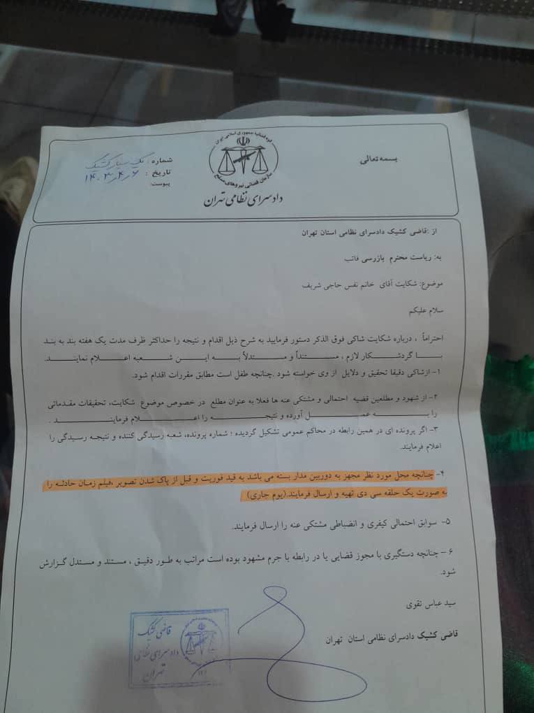 خانم عباسی تصاویری از شکایتش و اجازهی قاضی کشیک برای گرفتن فیلم دوربین مدار بسته و آثار باقیماندهی ضرب و شتم بر بدن دخترش را نیز برای ما فرستاده است.