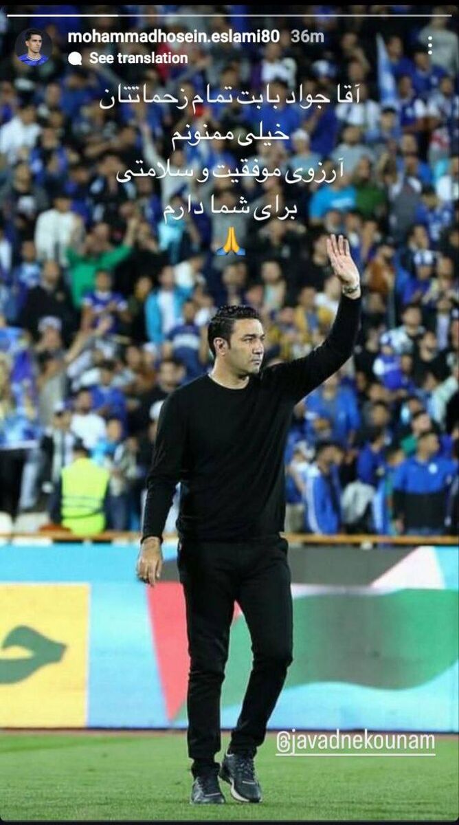 محمدحسین اسلامی بازیکن تیم استقلال پس از جدایی نکونام از تیم استقلال، با انتشار یک استوری از زحمات سرمربی خود قدردانی کرد.