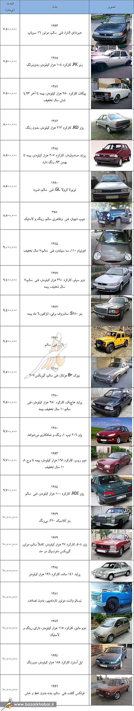 جدول زیر که لیست جدول قیمتی از ارزانترین (10 میلیون تومان و پایینتر) خودروهای بازار است، مصداق گفتههای بالا است.